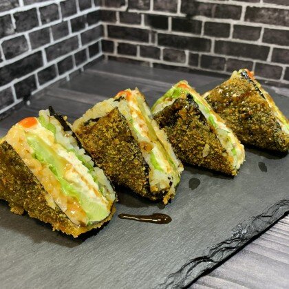 Рис, лосось, сливочный сыр, огурец, лист салата, соус «Унаги»