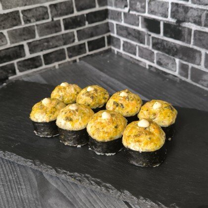 Рис, лосось, креветка, сливочный сыр, огурец, тобико, соус «Спайси»